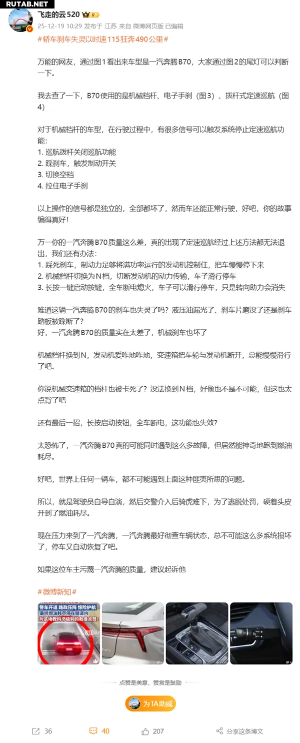 Однако многие пользователи сети, включая автоблогеров, выразили серьёзные сомнения в правдивости этой истории. Блогер под ником «@飞走的云520» (Flying Cloud) указал, что фигурирующая в сообщениях модель — FAW Bestune B70 — оснащена механическим селектором передач, электронным стояночным тормозом и отдельным подрулевым переключателем круиз-контроля.