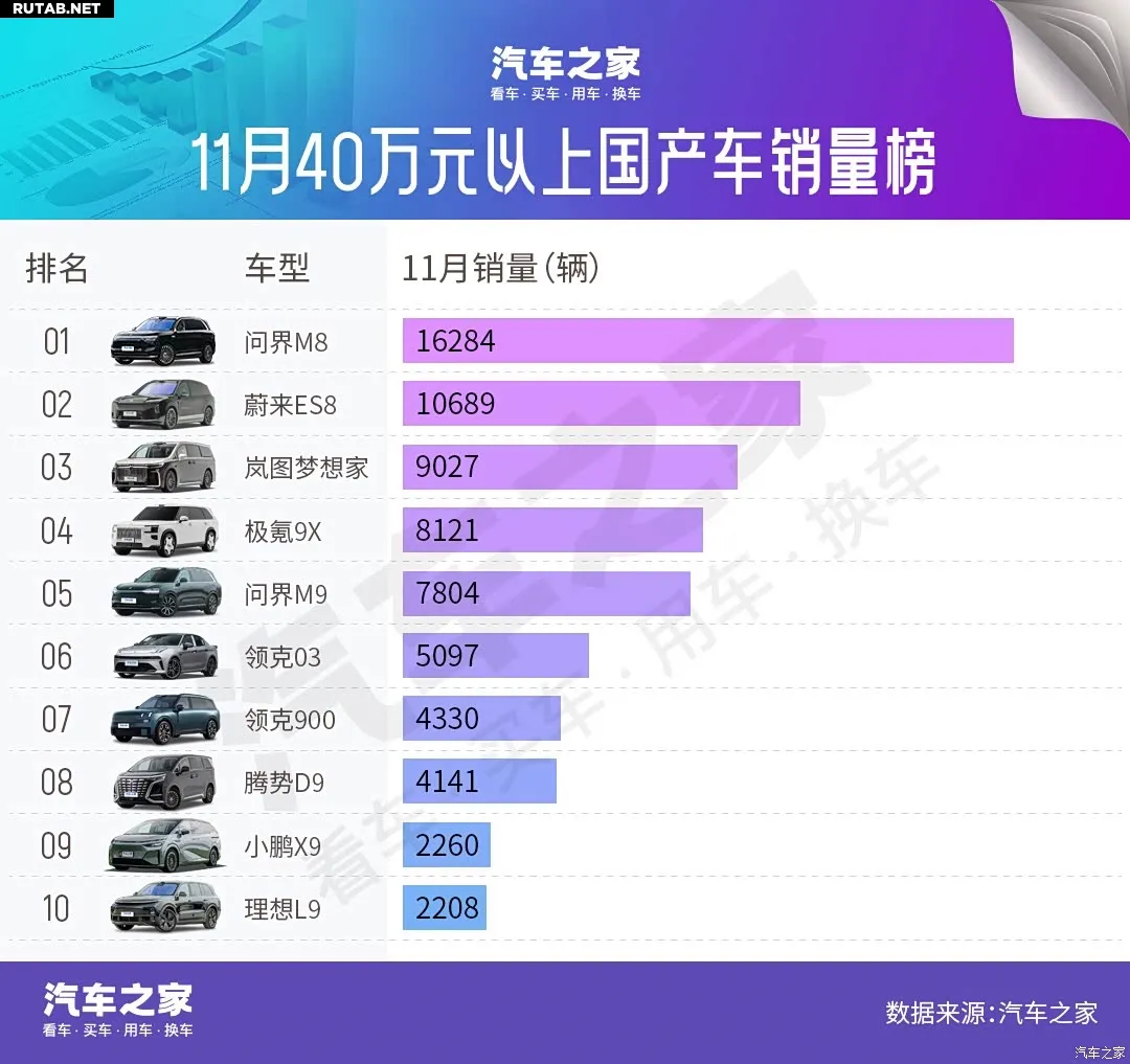 Автомобильный портал Autohome опубликовал рейтинг продаж машин дороже 400 000 юаней (~4 800 000 руб.) за ноябрь. В этом ценовом сегменте десять моделей преодолели рубеж в 1000 проданных единиц за месяц.