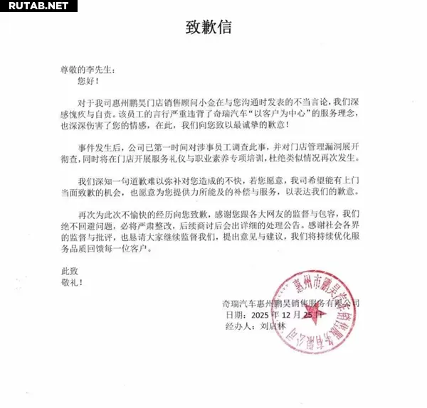 Автосалон Chery в Хойяне, к которому был приписан сотрудник, опубликовал официальное письмо с извинениями. В нём компания выразила «глубокое сожаление и раскаяние» и признала, что действия продавца противоречат принципам обслуживания клиентов бренда.