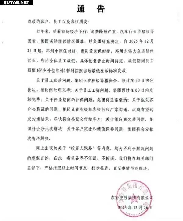 В документе говорится, что на фоне экономического спада, снижения потребительских расходов и ценовых войн в автопроме группа столкнулась с серьёзными финансовыми трудностями. В связи с этим было принято решение с 26 декабря 2025 года приостановить работу центров Porsche в Чжэнчжоу и Гуйяне, а также дилерского центра Volkswagen в Чжэнчжоу.