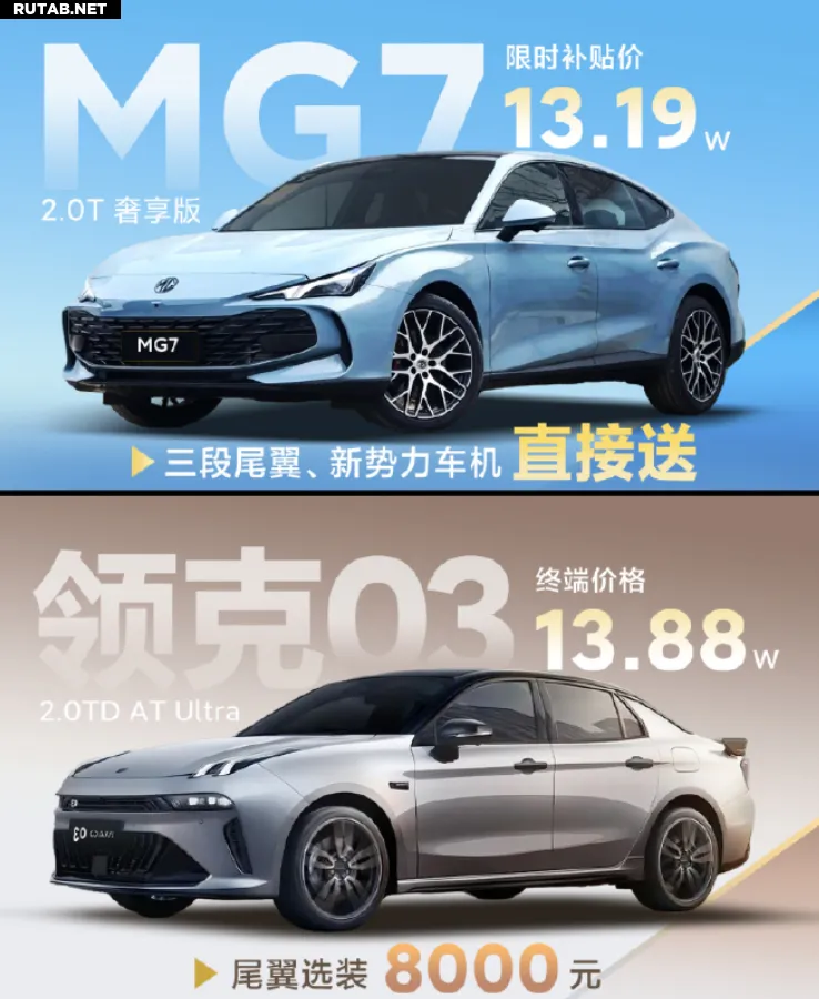 В этом сегменте прямым конкурентом MG7 является разве что Lynk & Co 03. Однако последний — это компактный седан, в то время как MG7, несмотря на спорную пропорцию колёсной базы (2778 мм), всё же больше (у Lynk & Co 03 — 2730 мм). При схожей мощности 2.0T MG7 дешевле на 7000 юаней (~84 000 рублей) и имеет в стандарте трёхсекционный спойлер.