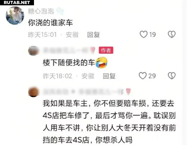 На вопрос пользователя: «Чью машину ты полила?» — женщина ответила, что взяла первую попавшуюся машину во дворе. На это другой пользователь заметил, что если бы он был владельцем, то заставил бы её не только оплатить ущерб, но и отвезти машину в официальный сервис на ремонт, а уже потом отругал бы за потраченное время.