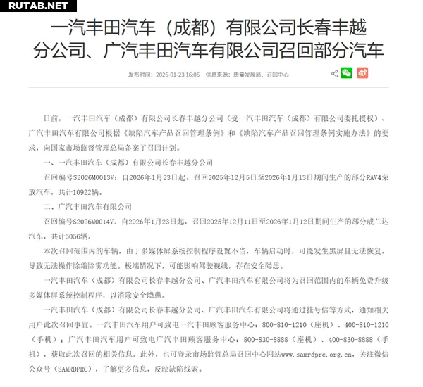 В рамках отзыва под номером S2026M0013V компания FAW Toyota (Чэнду) Co., Ltd. Changchun Fengyue Branch отзывает 10 922 автомобиля RAV4, произведённых в период с 5 декабря 2025 года по 13 января 2026 года.