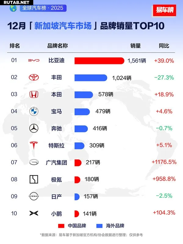 В Сингапуре подвели итоги автомобильного рынка за декабрь и весь 2025 год. Китайский производитель BYD показал выдающиеся результаты, заняв первое место как по месячным, так и по годовым продажам, оставив позади традиционных лидеров.