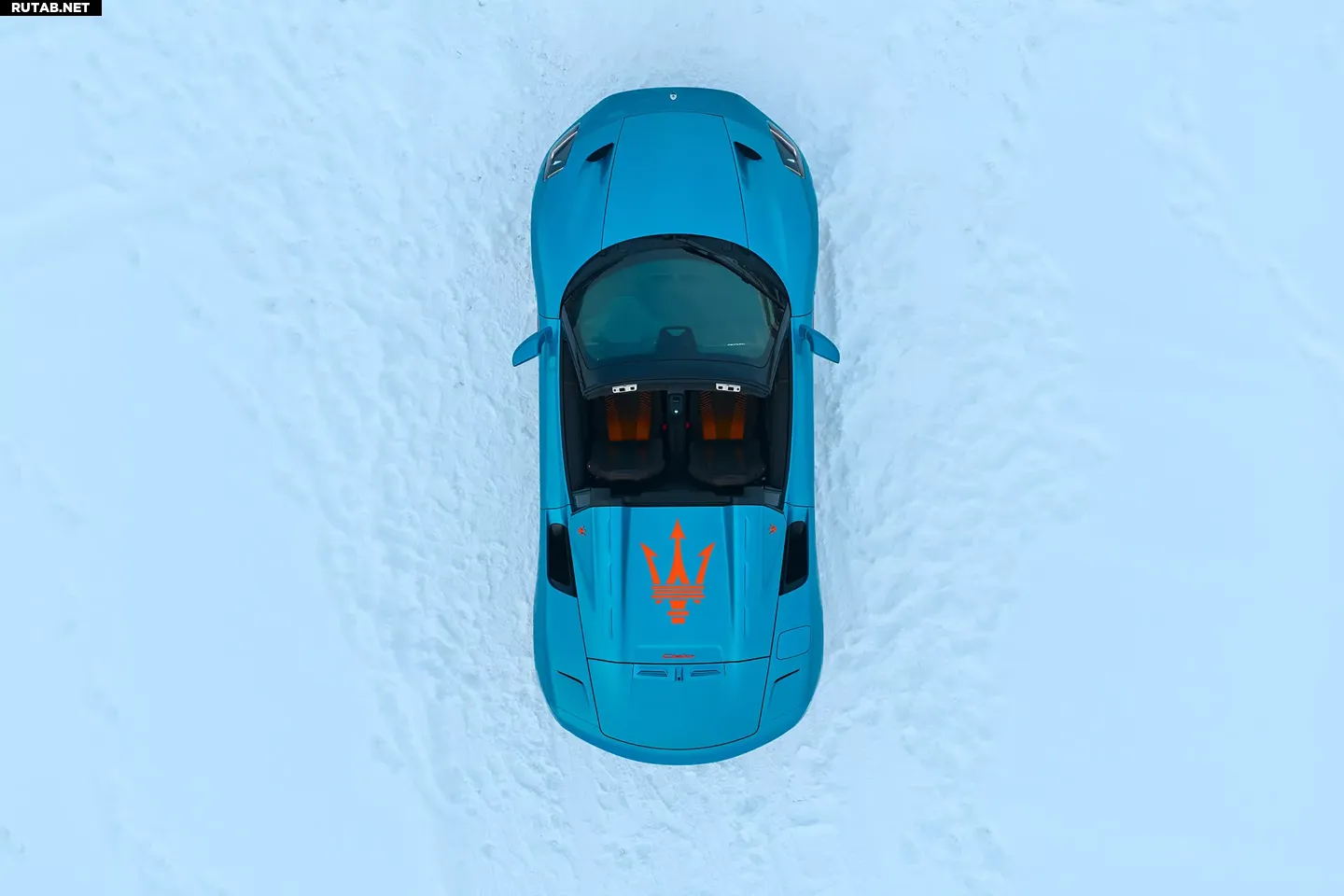 Карбоновый аэродинамический обвес, центральные колпаки колёс и тормозные суппорты выполнены в ярком оранжево-красном цвете, создавая сильный визуальный контраст с ледяным синим оттенком кузова. Знаменитый трезубец на решётке радиатора и стойках C-пиллара, а также боковые эмблемы окрашены в пурпурный цвет с синей слюдой.