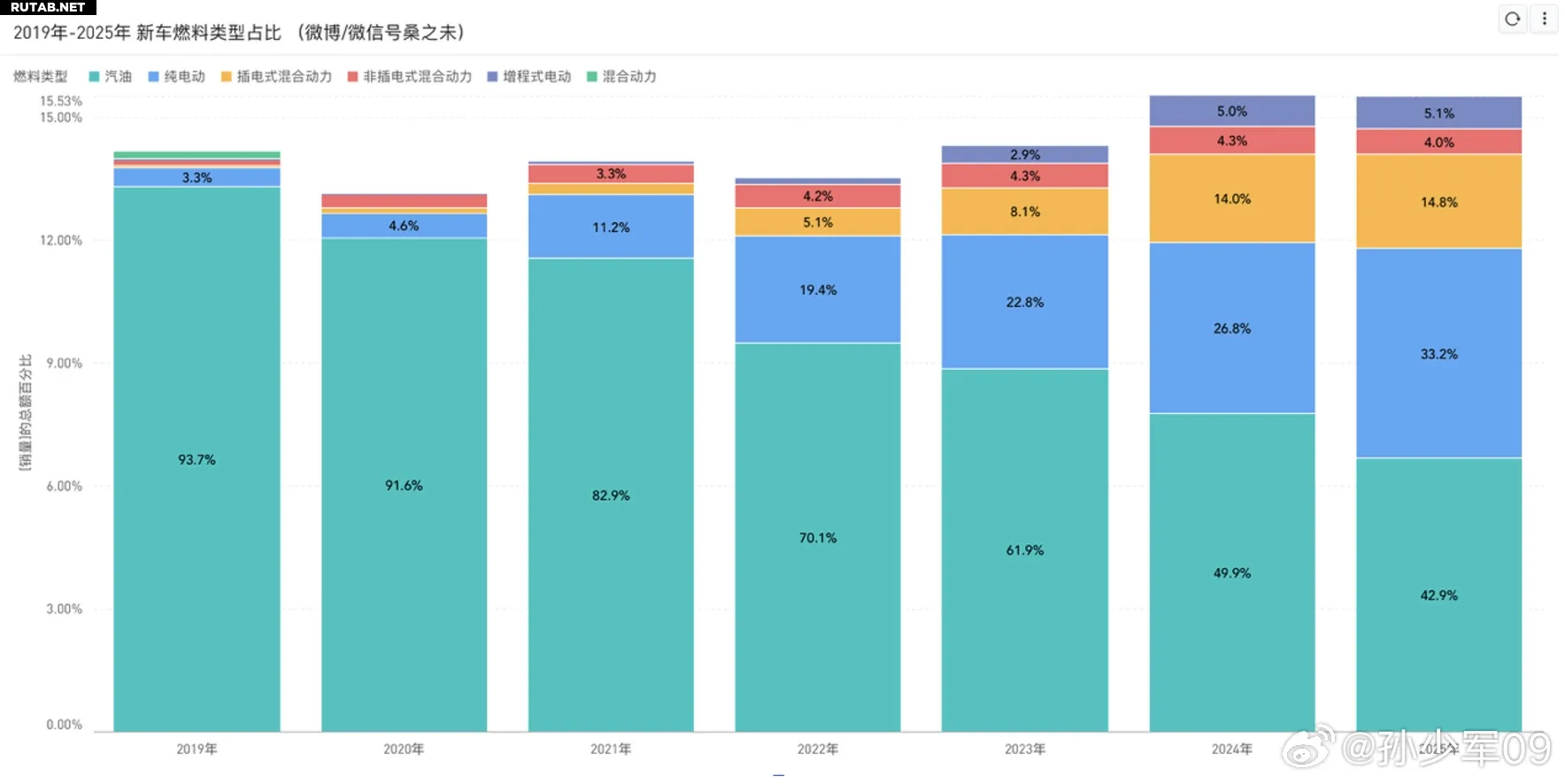 Блогер Sun Shaojun09 поделился диаграммами от аналитической компании Sangzhiwei, демонстрирующими кардинальные изменения на китайском автомобильном рынке с 2019 по 2025 год. Данные показывают, что продажи автомобилей с бензиновыми двигателями за этот период сократились более чем на 10 миллионов единиц, а их доля на рынке упала почти вдвое.