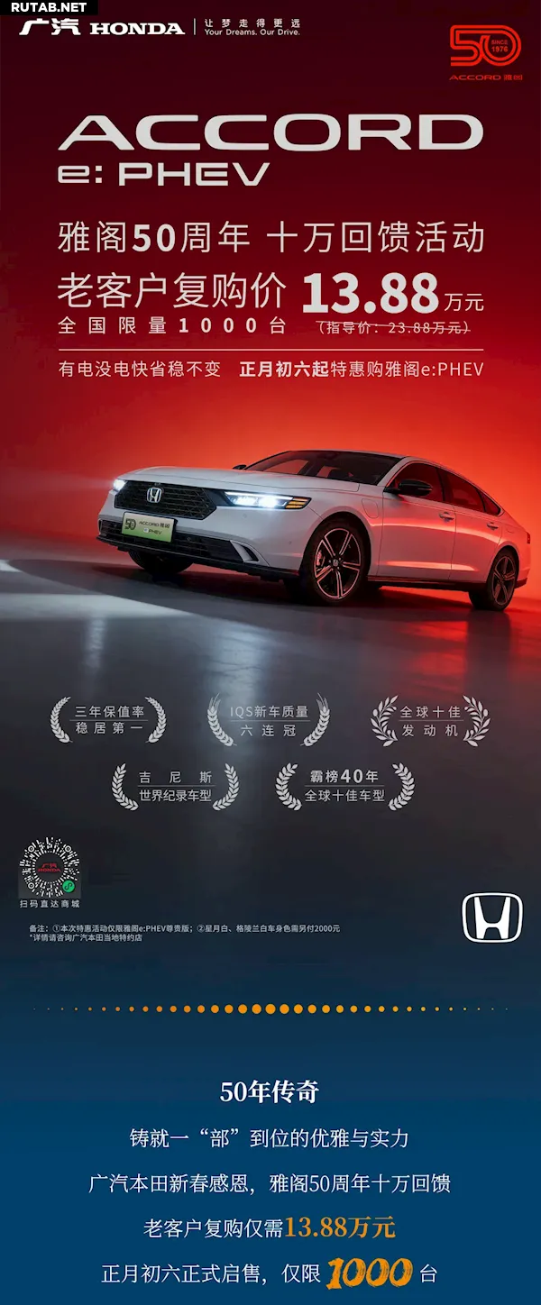 Компания GAC Honda объявила о специальном предложении для владельцев своих автомобилей в честь 50-летия модели Accord. Существующие клиенты, которые решат повторно приобрести подключаемый гибридный седан Accord e:PHEV, смогут сделать это по специальной цене в 138 800 юаней. Акция ограничена 1000 автомобилями.