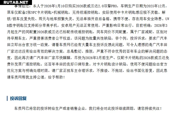 Особое возмущение владельцев вызвало то, что начиная с марта 2026 года, автомобили той же комплектации начали оснащаться традиционными брелоками в стандартной поставке. Таким образом, при одинаковой цене ранние покупатели получили урезанную комплектацию. Владельцы расценивают это как дискриминацию и требуют от производителя, компании GAC Toyota, выпустить официальную программу и бесплатно предоставить брелоки всем владельцам Wildlander 2026 модельного года, выпущенным до марта.