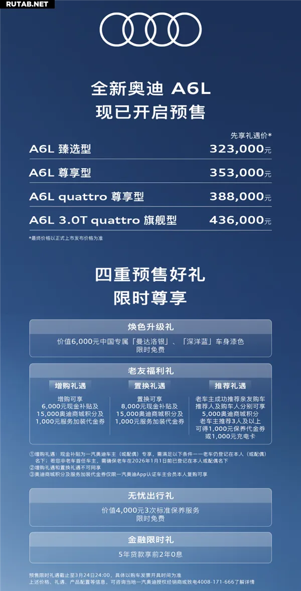 Сегодня Audi официально открыла предзаказы на полностью обновлённый седан A6L для китайского рынка. Предлагаются четыре комплектации по цене от 323 000 до 436 000 юаней. Ожидается, что поставки автомобилей начнутся уже в марте.