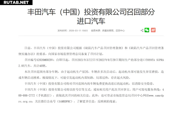 Примечательно, что Toyota Motor (China) также недавно отозвала по той же причине часть автомобилей SUPRA 2.0T в количестве 40 штук. Отозванные автомобили были произведены в период со 2 марта 2021 года по 29 сентября 2022 года.