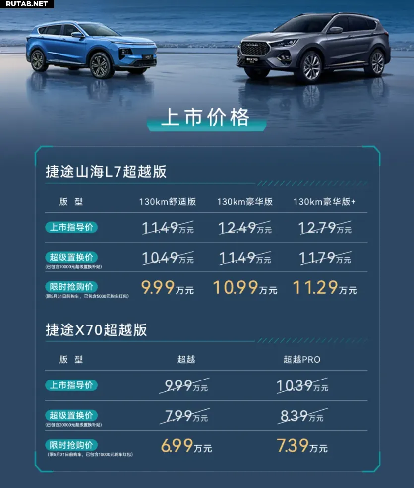 Модель Jetour X70 Beyond Edition 2026 года предлагается в двух комплектациях по цене от 99 900 до 103 900 юаней, однако действует ограниченное по времени предложение, снижающее ценник до 69 900–73 900 юаней. Shanhai L7 Beyond Edition доступен в трёх вариантах по цене от 114 900 до 127 900 юаней, а по акции — от 99 900 до 112 900 юаней.