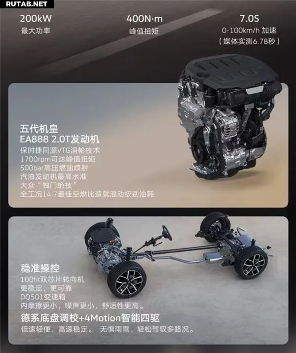 Сердцем обновления стал силовой агрегат. Новый Tayron получил двигатель EA888 2.0T пятого поколения. В стандартной комплектации — полный привод. Максимальная мощность составляет 200 кВт, пиковый крутящий момент — 400 Н·м. Разгон с 0 до 100 км/ч занимает менее 7 секунд. Автомобиль оснащен 7-ступенчатой роботизированной коробкой передач с двойным сцеплением. Заявленный расход топлива — 8,16 л/100 км, что, по словам производителя, обеспечивает баланс между динамикой и экономичностью.