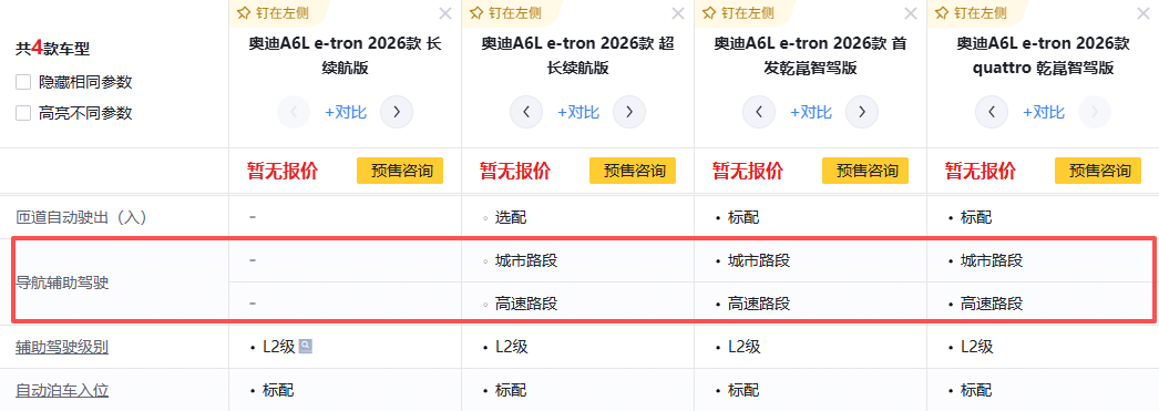 Что касается электрического A6L e-tron, то он построен на платформе с напряжением 800 В, оснащен батареей CATL на 107 кВт·ч, обеспечивающей запас хода до 815 км (по циклу CLTC). Мощность составляет 265 кВт для заднеприводной и 405 кВт для полноприводной версий. В оснащение входят опциональные цифровые зеркала заднего вида. Система помощи водителю Huawei乾崑(Qiankun) доступна для заказа на всех версиях бензинового A6L, но на базовой комплектации A6L e-tron её установить нельзя.