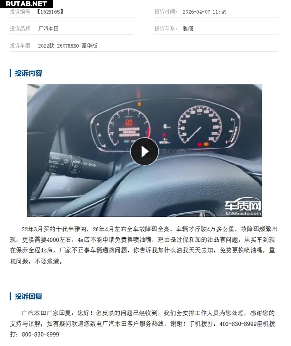Один из заявителей купил Honda Accord десятого поколения в марте 2022 года. В апреле 2026 года на приборной панели начали постоянно появляться ошибки, хотя пробег автомобиля составлял чуть более 40 000 километров. По оценкам, замена форсунок обойдется примерно в 4000 юаней (~48000 руб.).
