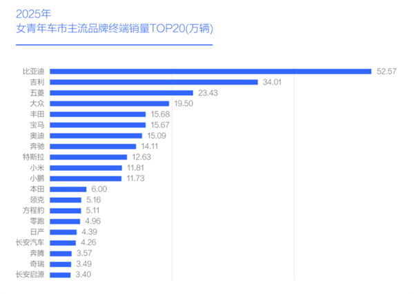 Соответственно изменились и объемы продаж брендов. В 2025 году тремя наиболее покупаемыми брендами среди молодых женщин были BYD, Geely и Wuling. Geely, делая ставку на небольшие электромобили, такие как Xingyuan и Panda, продала 340 000 автомобилей женщинам за год, что сделало ее более популярной среди женщин, чем зарубежные бренды, такие как Volkswagen, Toyota и Honda.