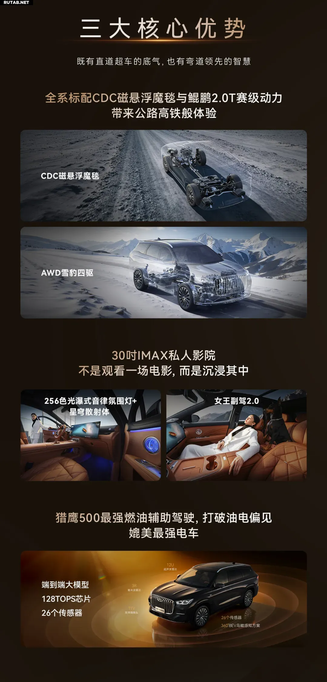 Главной особенностью новинки является набор из девяти функций, которые стали стандартными для всех версий. В этот список входят: подвеска на магнитной левитации CDC, двигатель Kunpeng 2.0T (261 л.с., 400 Н·м), 30-дюймовый интегрированный экран 6K, чип Qualcomm Snapdragon 8255, 13-слойные комфортабельные сиденья, до 10 подушек безопасности, санитарный отсек, 360-градусный видеорегистратор и 20-дюймовые колёса.