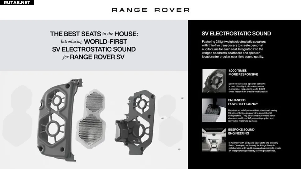 Ключевым новшеством модели стала аудиосистема. Range Rover SV ULTRA дебютирует с технологией автомобильных электростатических динамиков. Система состоит из 21 сверхлегкого мембранного излучателя толщиной всего 1 миллиметр. По заявлению производителя, скорость реакции таких динамиков в 1000 раз выше, чем у традиционных, а вес и энергопотребление снижены на 90%. Динамики не содержат редкоземельных элементов и изготовлены из 100% перерабатываемых материалов, обеспечивая звучание студийного качества.