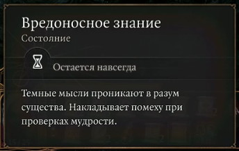 Перед тем как открывать и читать книгу, сохранитесь. Вам предстоит пройти сразу 3 проверки на мудрость. В случае неудачи персонаж получит отрицательный статус. Провал на третьей проверке дает постоянный отрицательный статус «Вредоносное знание».