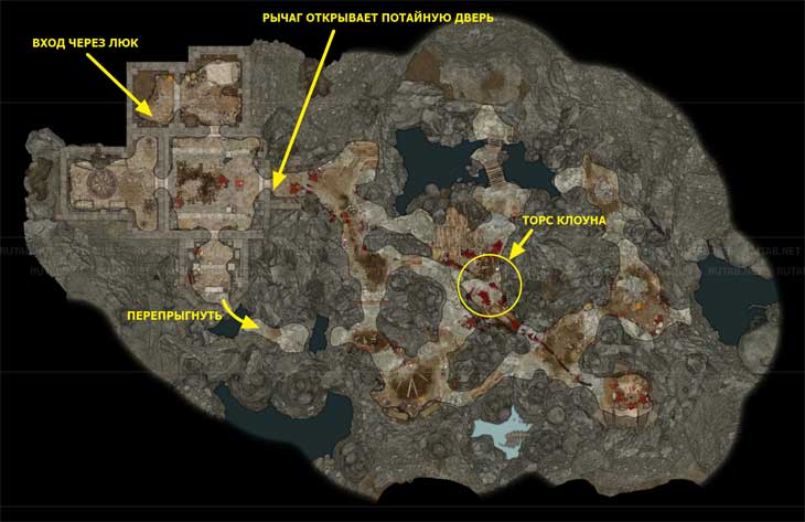 Спуститесь через деревянный люк в храме Открытой Длани. Вы попадете в склеп (здесь также можно завершить задание Помочь проклятому монаху). Убейте оборотней и проверьте их тела, чтобы получить торс клоуна.
