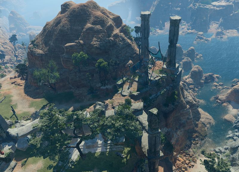 Юг Изумрудной рощи защищен валами. Толстые ворота можно открыть только с помощью лебедки, находящейся неподалеку. Боевой рог позволяет защитникам сплотиться, если Роща подвергнется нападению. К востоку от валов находится высокий холм, на котором тифлинг Надира установила свой телескоп. Игрок может вмешаться, чтобы спасти ее. Тропа вьется на север от холма к лифту, ведущему к Священному пруду. Пока медведь Горка не двинется с места, лифт неработоспособен.