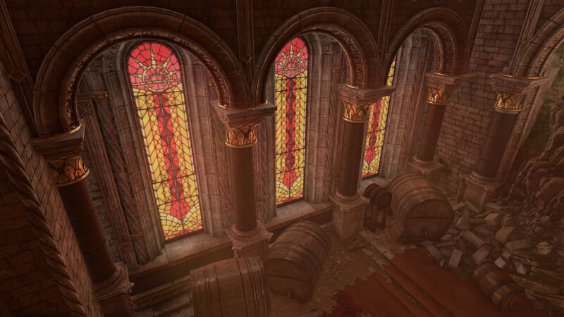Комната с витражом, изображающим четырех бывших смотрителей монастыря Розиморн, и четырьмя постаментами, изображающими каждого из них X:75 Y:75.