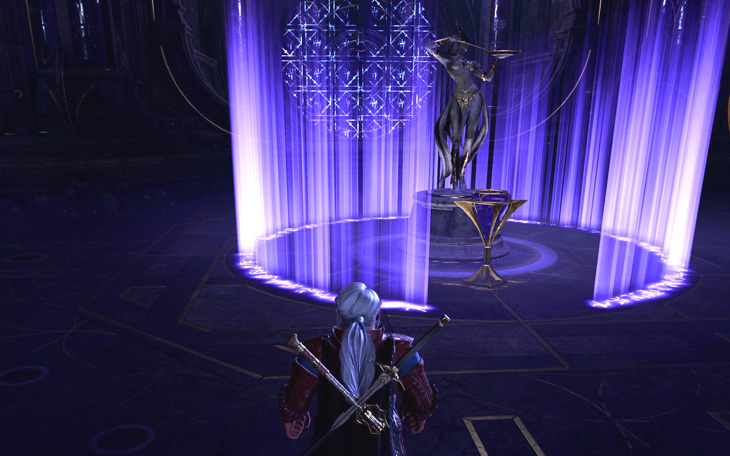 Любые лунные фонари или другие источники света также не должны быть экипированы. Когда комната полностью погружается во тьму, вокруг статуи появляются фиолетовые глифы. Следуйте через промежуток в глифах, чтобы прикоснуться к самоцвету. Это открывает путь на север.
