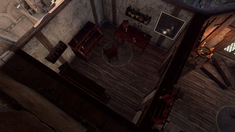 В подвале табличка с надписью «Огненный Кулак – в эту сторону!». Эта область плотно заставлена бочками со смазкой, которые загораются, если группа входит туда. Вместо этого оставайтесь на кирпичной дорожке справа и войдите в преддверие трибунала X: -1302 Y: Y:519.