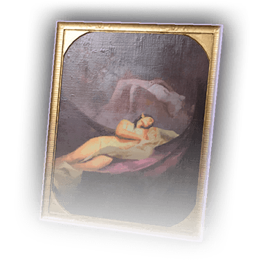 На этой картине Кореллон изображен не как прекрасный златовласый эльфийский бог, а в обличье темноволосой эльфийской богини. Ее грациозное тело выглядит особенно изящным на фоне бордового муслина.