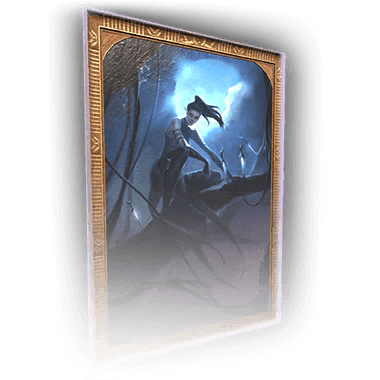 На этой картине изображена эльфийка с уверенным, проницательным взглядом. Еще немного, и она вонзит свои богато украшенные кинжалы в ничего не подозревающую жертву.
