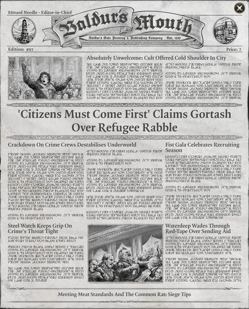 «Балдурский вестник»: 1492 г., выпуск 83 — номер газеты «Балдурский вестник» со статьями о Горташе, Культе Абсолют и беженцах во Вратах Балдура.