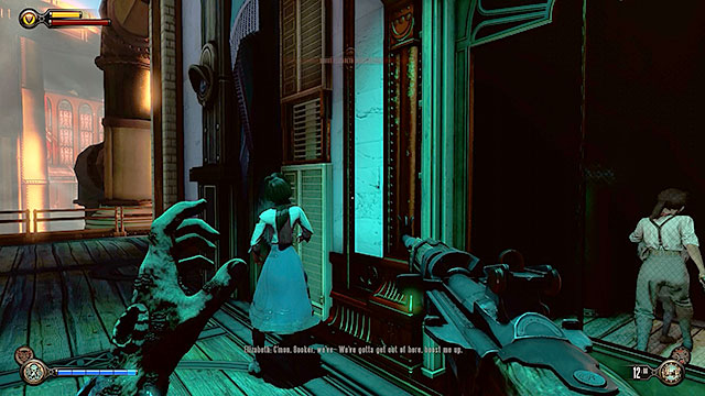 Двигайтесь на платформу, расположенную под офисом Финка. Дождитесь получения инструкций и поднимите Элизабет, чтобы она могла войти в вентиляционную шахту. Теперь можете подойти к стеклянной двери. Постучите в дверь, чтобы отвлечь Дейзи. Подождите, пока Элизабет выполнит свою часть работы. Ободри её и войди в офис.