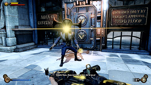 Войдя в здание, двигайтесь вперед, и вскоре вы достигнете закрытых ворот, которые охраняет Молчаливый мальчик. Это новый тип противника. Мальчик могущественный, и вы столкнетесь с большим количеством из них, исследуя дом Комстока. Очень важно знать, что «Мальчики молчания» не нападут на вас, если вы не создадите слишком много шума или не окажетесь в лучах света, излучаемых их масками. Обратите внимание на странных существ в масках Бенджамина Франклина, которые сопровождают мальчиков - никто из них не будет нападать на вас, пока вы останетесь незамеченными. Самого невозможно убить мальчика после того, как он вас обнаружит, потому что тогда он завладеет одним из «Франклина» и использует это тело для организации атак. Разберитесь с первым Молчаливым мальчиком и затем нажмите кнопку, которую он охранял.