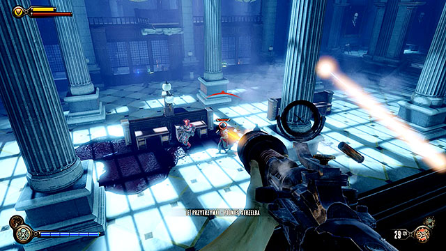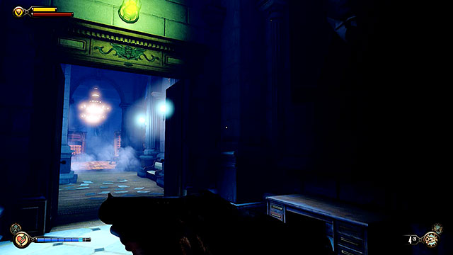 Вернитесь в главный зал банка и пройдите в правый коридор (тот, по которому идет тропа Леди Комсток). Вы заметите красного ворона, проходя через этот коридор, и будете рассматривать его как предупреждение о предстоящих битвах.