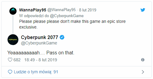 Студия CD Projekt RED не планирует заключать эксклюзивные контракты с Epic Games Store. Информация по этому вопросу была предоставлена разработчиком в Twitter в ответ на вопрос одного из фанатов.