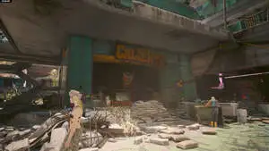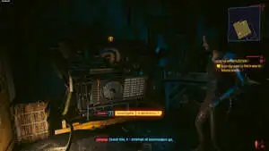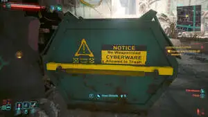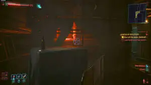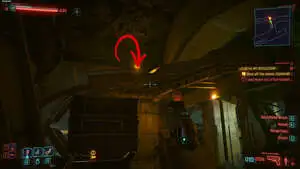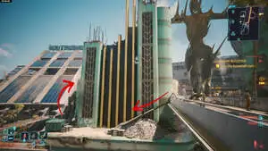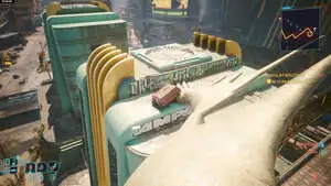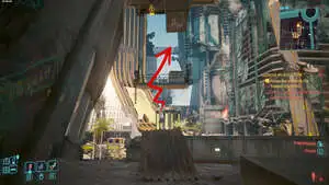 - Наверху здания, где находится ресторан, находится терминал данных Militech. Вы можете получить к нему доступ, поднявшись на главный мост, спустившись на выступ и поднявшись по бокам, пока не достигнете открытого пола.
