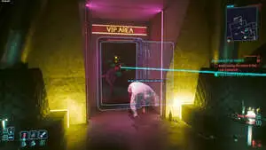 Теперь вам просто нужно найти путь наверх. Направляйтесь к дверному проему VIP-зоны, отмеченному на вашей карте, и вы увидите, как мужчину выгнали, а дверь за ним закрылась. Вы не сможете сразу войти, поэтому вам нужно будет найти способ открыть дверь. К счастью, поблизости есть терминал, который позволит вам войти.
