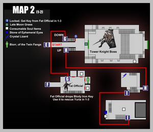 Спуститесь по лестнице до конца и войдите в дверь тумана, чтобы встретиться со следующим боссом, Рыцарь Башни. Чтобы узнать, как победить этого босса, обратитесь к отдельной странице Рыцарь Башни.