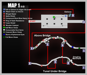 Слева от вас есть тело с x3 Трава полумесяца. За открытыми железными воротами Солдат Болетарии с арбалетом. Разрушьте деревянную баррикаду, и за этой точкой вы найдете Отребье Торговца, сидящего на сундуке. Вы можете взаимодействуйте с ним, если хотите торговать.