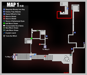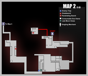 Спрыгните с балкона налево, и вы окажетесь перед туманной дверью. Войдите и поверните направо, на вас нападет Рыцарь Красного Глаза, продолжайте идти по коридору и поверните направо.