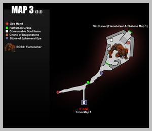 Если вы пойдете по другому пути, вы попадете в заполненную лавой область, заполненную гигантскими медвежьими жуками, слева от вас есть тело, в котором содержится x2 Часть драконьего камня.Левый путь: С левой стороны вы попадете в заполненную лавой область со множеством гигантских медвежьих жуков. Возле выхода есть тело, в котором находится x1 Душа знаменитого героя. Вы можете получить x1 Целый драконий камень и x2 Часть драконьего камня, если продолжаете идти вперед. Передний путь: Перед вами еще один Гигантский жук-медведь, за ним - тело с изображением Камень эфемерных глаз x1. Вы не можете продвигаться дальше и должны выбрать один из двух других путей. Теперь войдите в дверь тумана и приготовьтесь встретиться с Огненным Соглядатай.