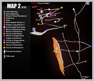 Берите, он пойдет немного вверх, вы дойдете до бреши, а на другой стороне клад. Если вы упадете, справа от вас будет взрывающийся свет, если вы пройдете мимо него, вы упадете в комнату перед той, в которой был Путеводный камень. Слева от вас путь разветвляется, выберите левый путь и разрушьте хребет, чтобы добыть x1 Драконий длинный меч +1.