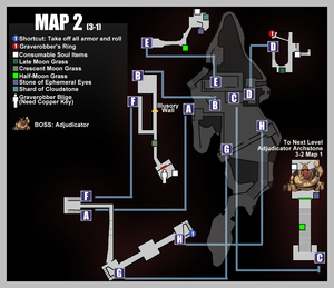 Двигайтесь и поверните направо, слева от вас будет труп, содержащий x3 Трава полулуния, и Черный Скелет, охраняющий дверь тумана, ведущую к боссу.