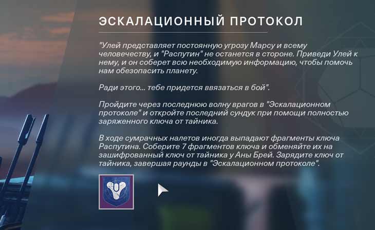 Как только вам удастся убить финального босса эскалационного протокола, он сбросит сундук с добычей, а также некоторые дополнительные награды, которые являются эксклюзивными. Расшифрованный ключ от тайника необходим для открытия этого сундука. Боссы эскалационного протокола еженедельно меняются (вместе с наградами, см. Расписание эскалационного протокола), но ваши ключи и фрагменты будут переноситься с недели на неделю.