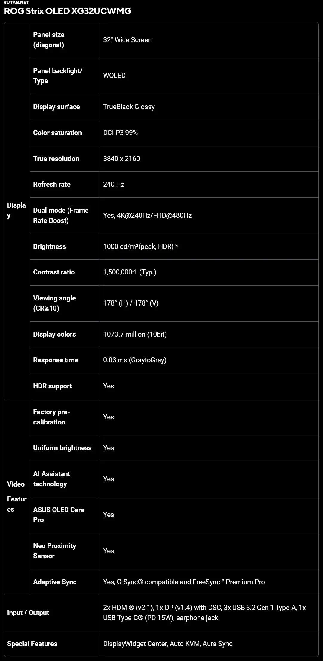 ASUS представила игровые мониторы ROG Strix OLED XG32U с частотой до 480 Гц