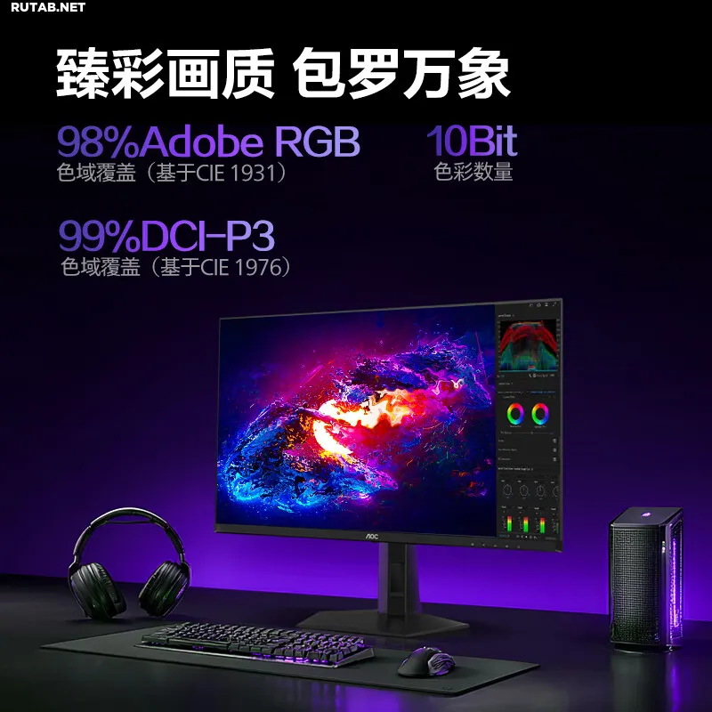 Монитор поддерживает настоящий 10-битный цвет и имеет заводскую калибровку. Каждое устройство проходит 25-точечную калибровку BU с Delta E менее 2. Панель охватывает 98% цветового пространства Adobe RGB и 99% гаммы DCI-P3, что делает монитор подходящим для творческих профессионалов, требующих высокой точности цветопередачи.