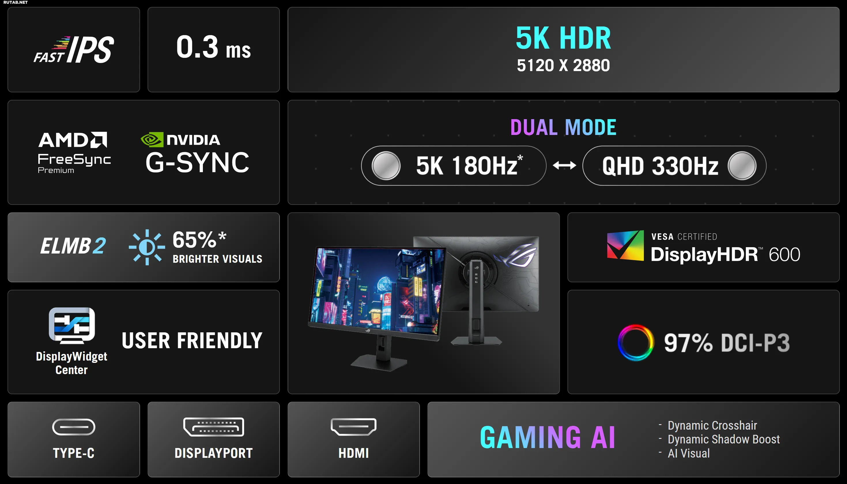 Компания Asus не анонсировала, но уже разместила на своём сайте страницу нового флагманского игрового монитора ROG Strix XG27JCG. Модель выделяется не только разрешением 5K (5120 x 2880) и частотой 180 Гц, но и двойным режимом работы, который позволяет переключаться на 1440p с частотой 330 Гц.