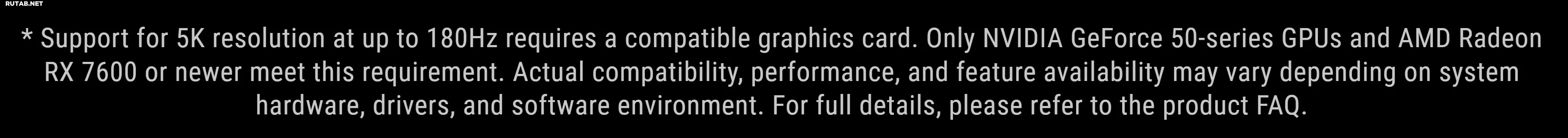 Самое интересное — в требованиях к видеокартам. Для работы в режиме 5K 180 Гц с HDR и без субдискретизации цветности Asus официально указывает поддержку только видеокарт NVIDIA серии RTX 50 и AMD RX 7600 или выше. Это связано с тем, что для такого режима требуется пропускная способность интерфейса DisplayPort 2.1, который отсутствует у видеокарт NVIDIA RTX 40-й серии. Карты AMD RX 7000 получили DP 2.1 ещё в прошлом поколении, поэтому совместимы.