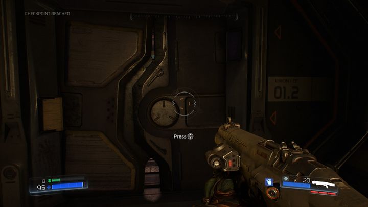 Откройте большую дверь после перехода на другую сторону. За дверью три сильных противника. Используйте гранату на них. Бегите вокруг врага со щитом и стреляйте в него сзади. За другим проходом начнется короткая битва с импами. Убейте их быстро и используйте компьютер на правой стороне. Он откроет ближайшую дверь, из-за которой побежит Одержимый солдат. Когда существо мертво, возьмите журнал данных слева [8] и затем осторожно идите к недавно открытому коридору. Лучше всего убивать врагов внутри, оставляя в живых только солдата со щитом. Это позволит вам безопасно ходить и добить его.