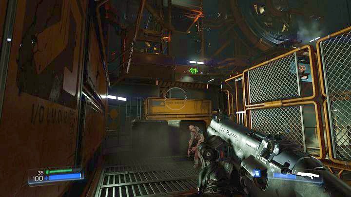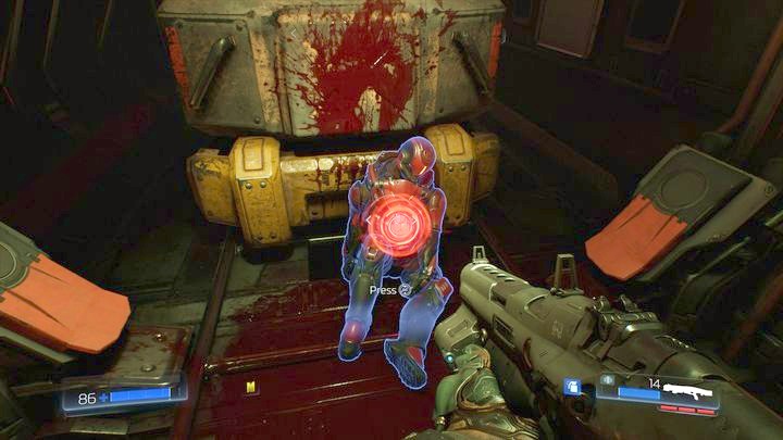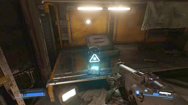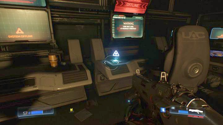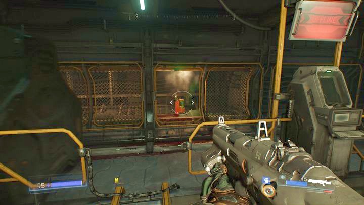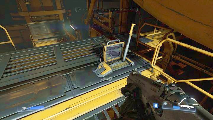 Продолжайте идти вперед после встречи с первым Одержимый инженер. Вы достигнете большей комнаты с большой группой врагов. Как только вы убьете всех демонов, можете пройти к другой стороне локации и возьмите бревно, лежащее под стеной.