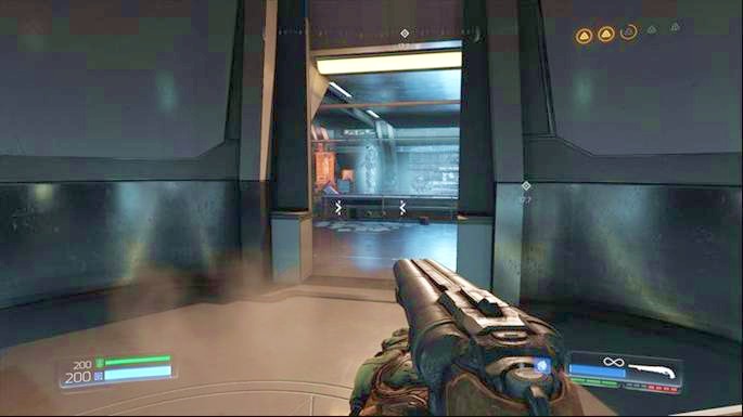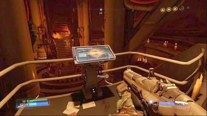Лифт появится. Вы должны прыгнуть на это. Оказавшись выше, пройдите вперед, а затем опуститесь на этаж ниже. После того, как вы войдете в дверь, демоны нападут. Убейте их и поверните направо. Вы доберетесь до комнаты с медицинской станцией и компьютером, которым вы должны пользоваться.
